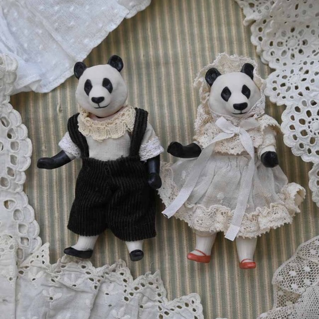 アンティークから型取りして制作した オールビスク約8.5cmのミニチュアサイズドールです。 ヘッドはパンダ、ボディはお人形のスタイルで 不思議な魅力のある一体。 アンティーク・ヴィンテージファブリックやレースでおめかししています。 モノトーンで落ち着いた雰囲気も魅力的です。 大きなお人形さんのお持たせに ドールハウスに 是非コレクションに加えて頂けましたら幸いです。 【サイズ】 体長 約8.5cm (若干の個体差はご容赦下さい) 【仕様】 オールビスクヘッド+トルソ+手足(首、手足稼働) ペインテッドアイ(描き目) アンティーク・ヴィンテージファブリックドレス オールビスクのドールは、樹脂製のドールと違い黄変などなく 素手で触っても、お出かけで紫外線に当たっても安心です。 大人が永く愛でるのに相応しい ビスクドールを是非お手元でお楽しみください。 ※ビスク(白磁)・焼き付け着彩(半永久的に褪色劣化無し) ※強い衝撃や鋭利なもので擦るなどはお避け下さい ※ 送料につきましては ・宅急便着払い【お受取時にお支払】神奈川発60サイズ のみとなっております。