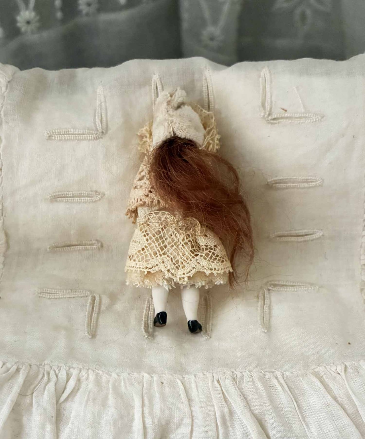 アンティーク素材(一部ヴィンテージ)を使用したドレスを纏った一体です。