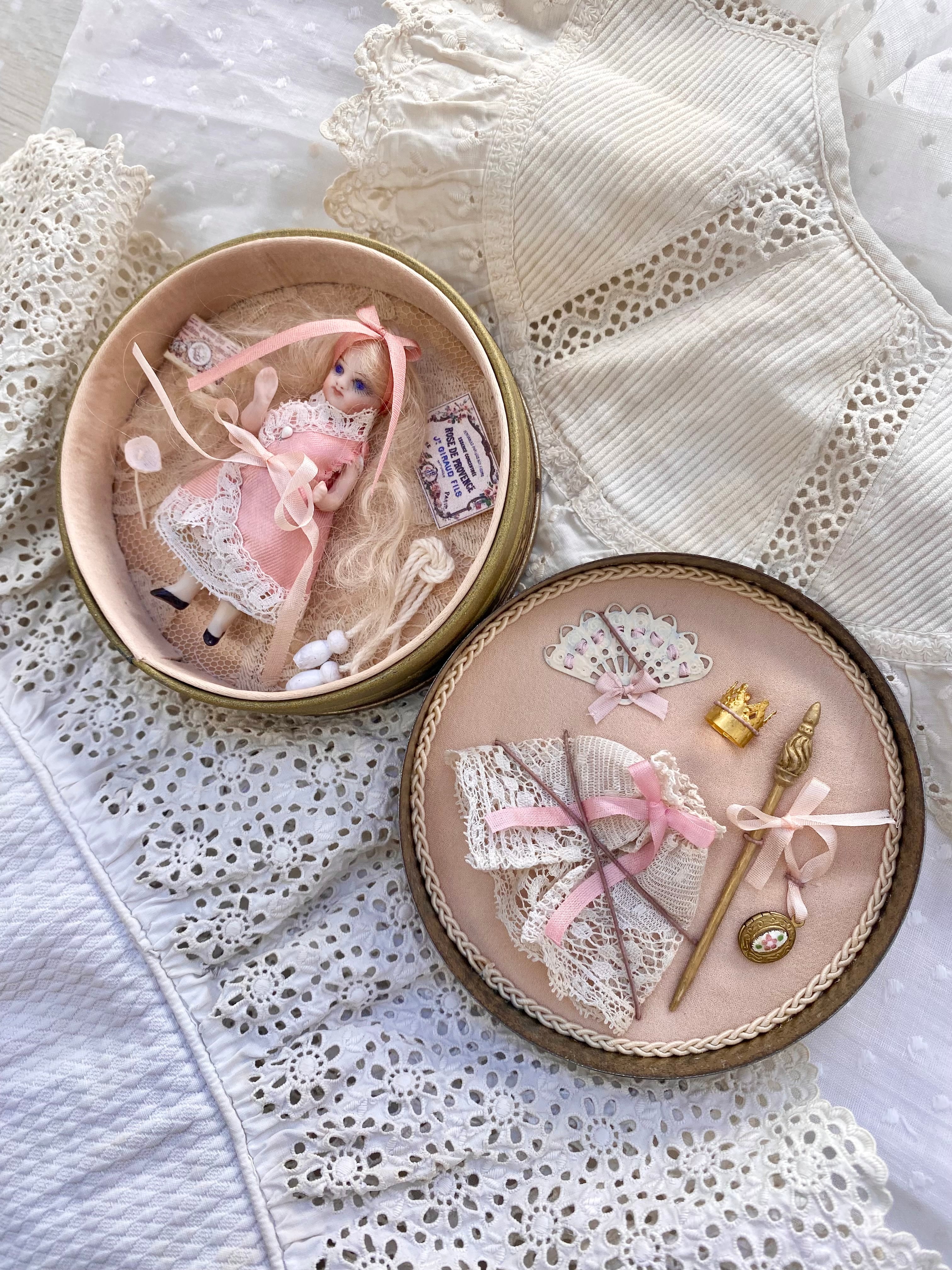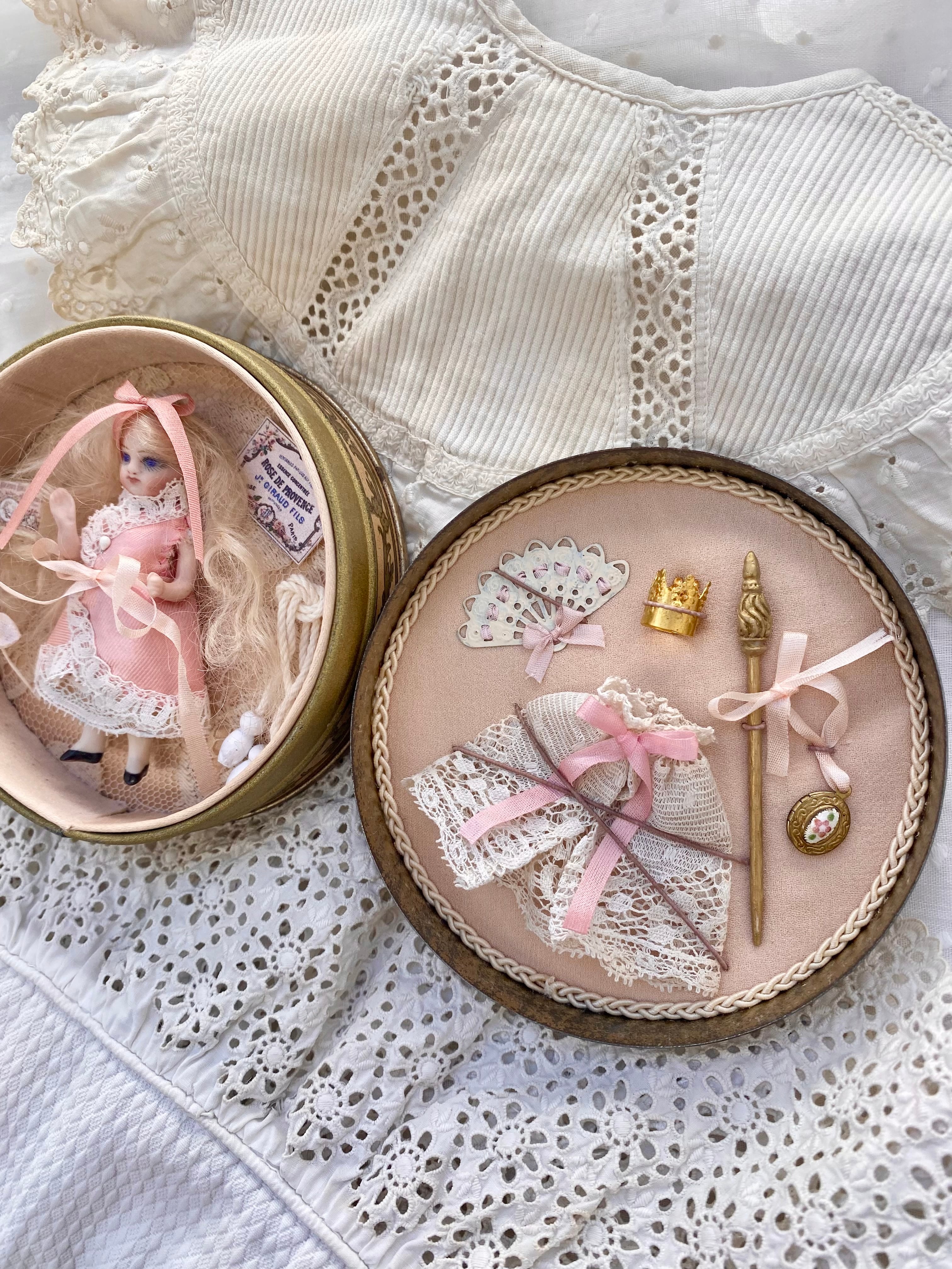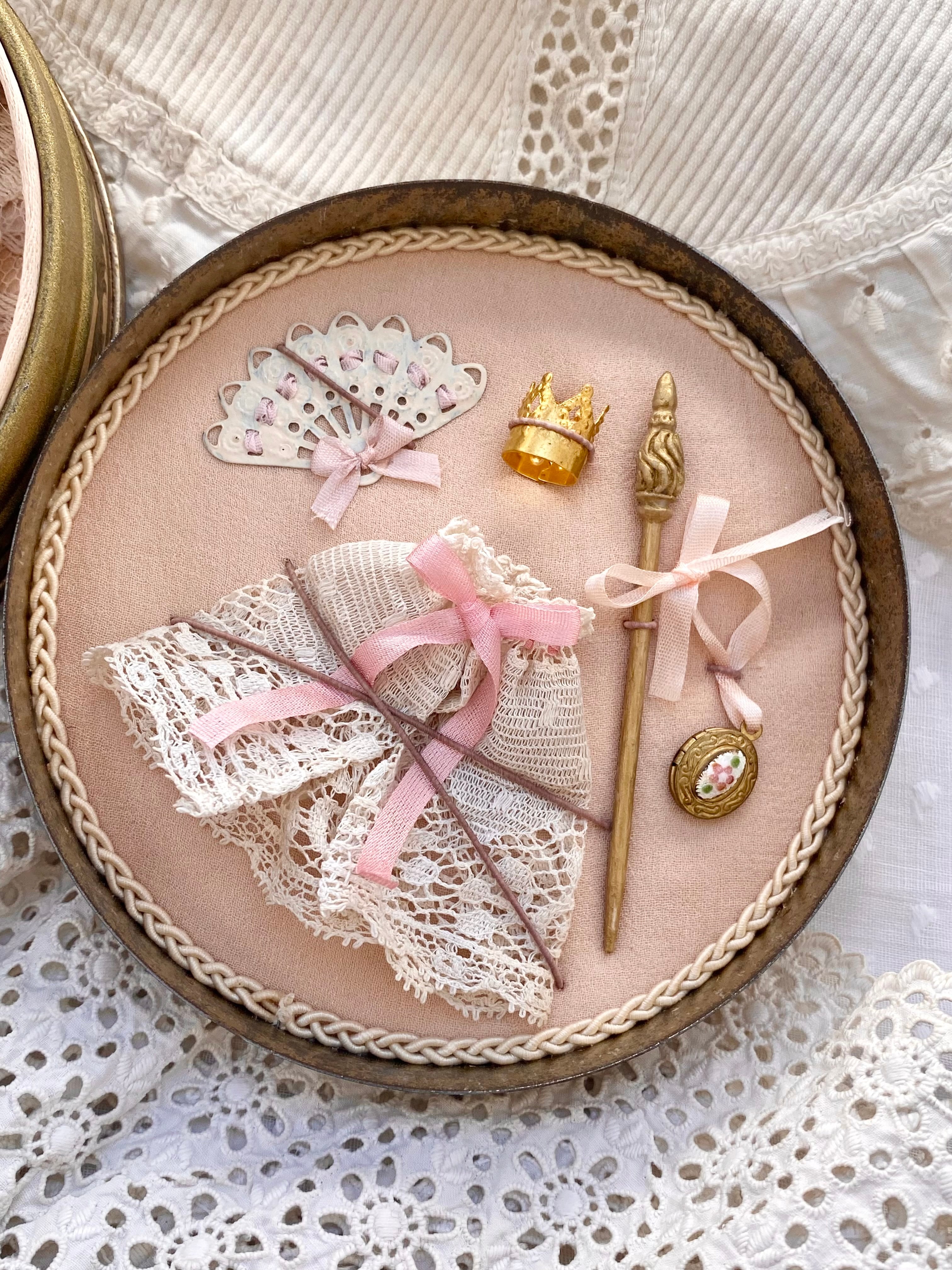 王冠、ステッキ、エナメル付きロケット(開閉可能)、アンティークレースケープ、縄跳び、紙箱、布花、ミニチュアカード、扇子