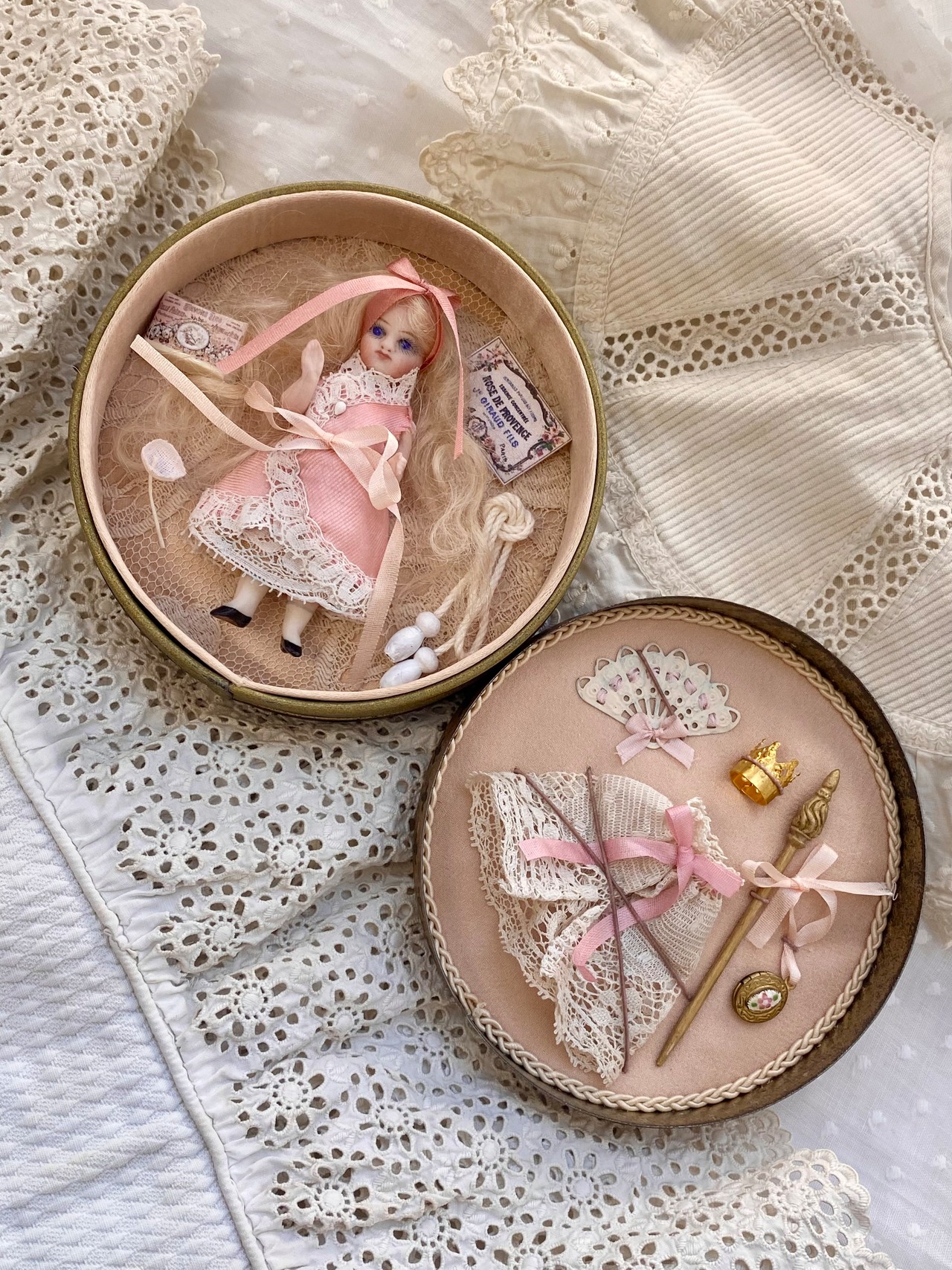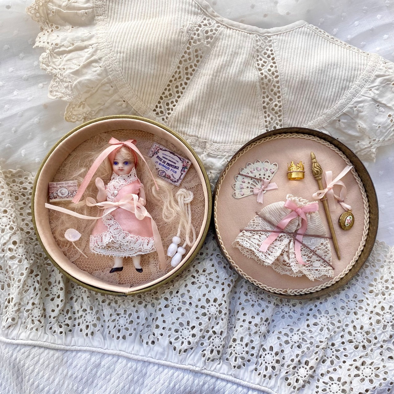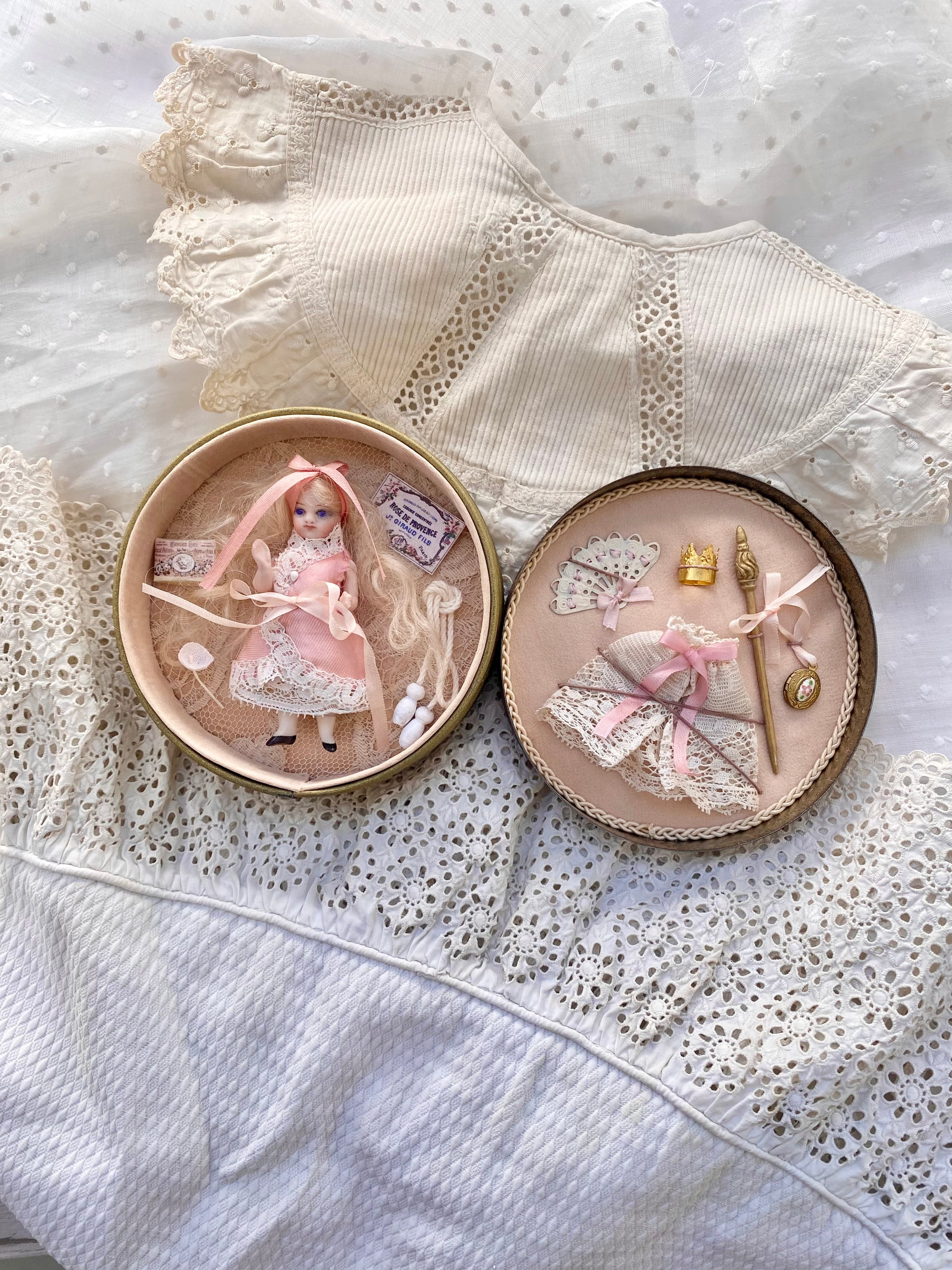 王冠、ステッキ、エナメル付きロケット(開閉可能)、アンティークレースケープ、縄跳び、紙箱、布花、ミニチュアカード、扇子