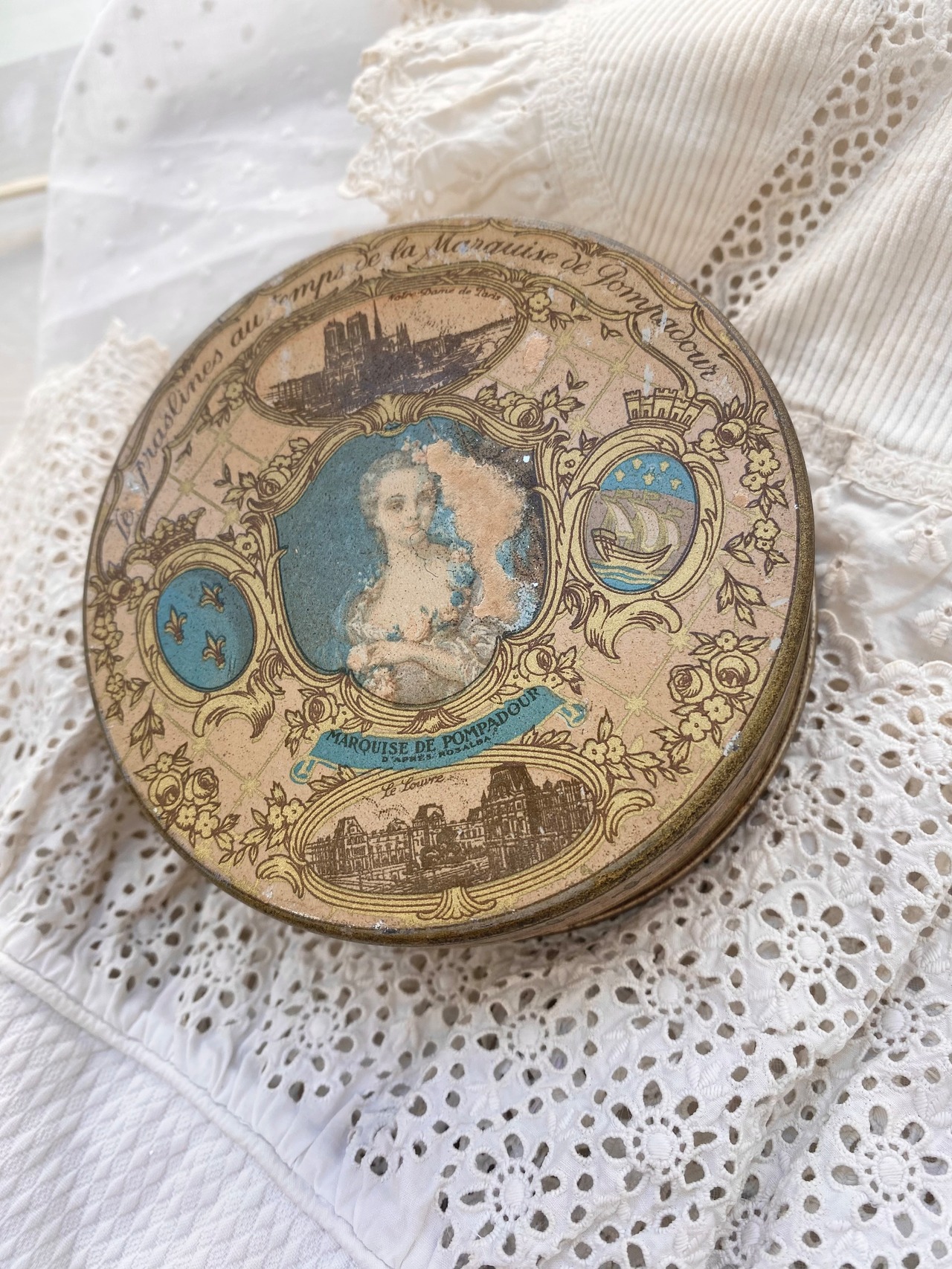 アンティーク缶、アンティークシルクサテン、アンティークレース、アンティークシルクシフォン貼り