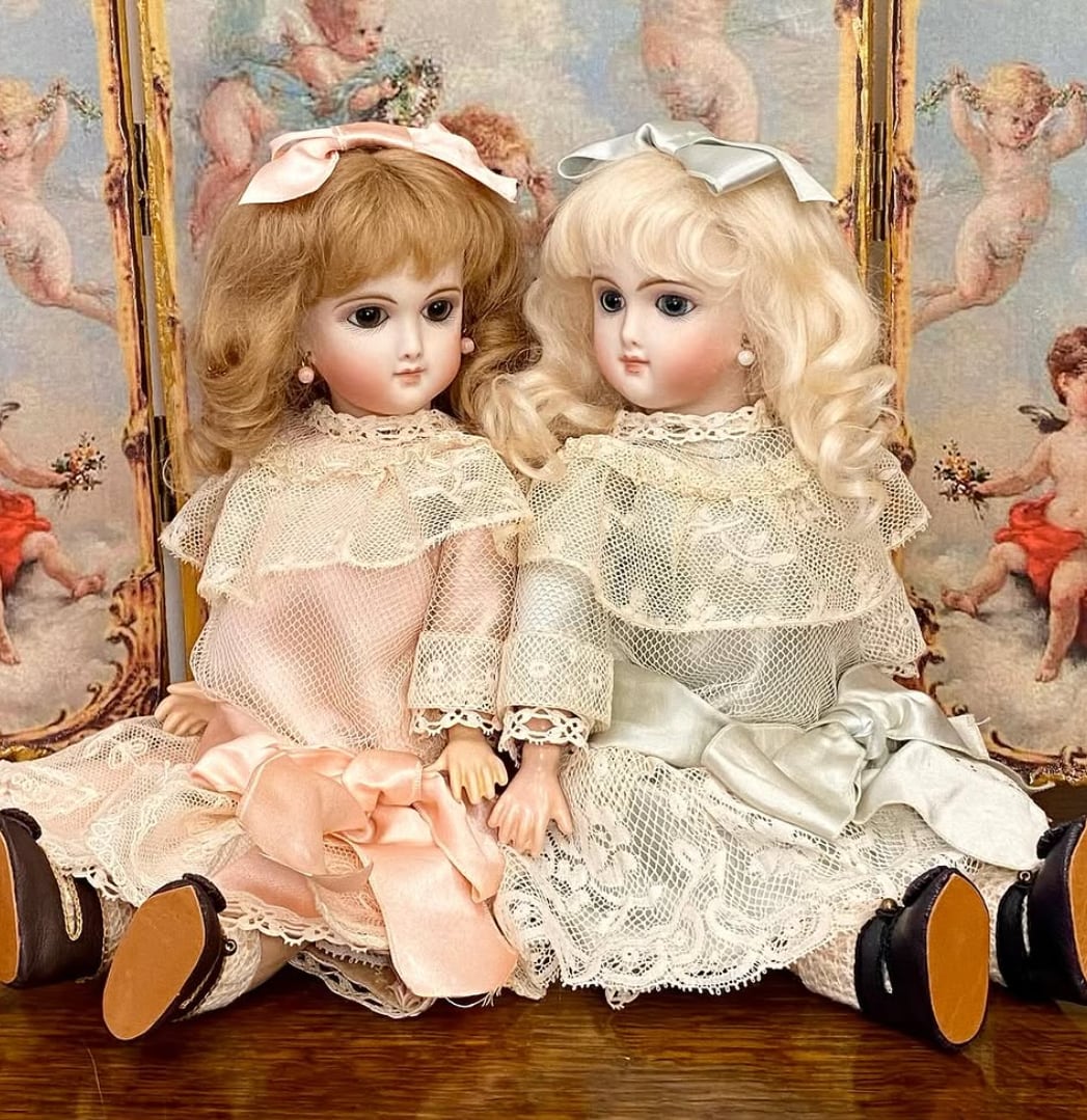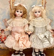 光沢あるシルクのドレスにアンティークチュールレースのドレスを重ね着して、ウエストリボンをゆったりと結った、19世紀らしいべべドレスの小さなべべドールです。